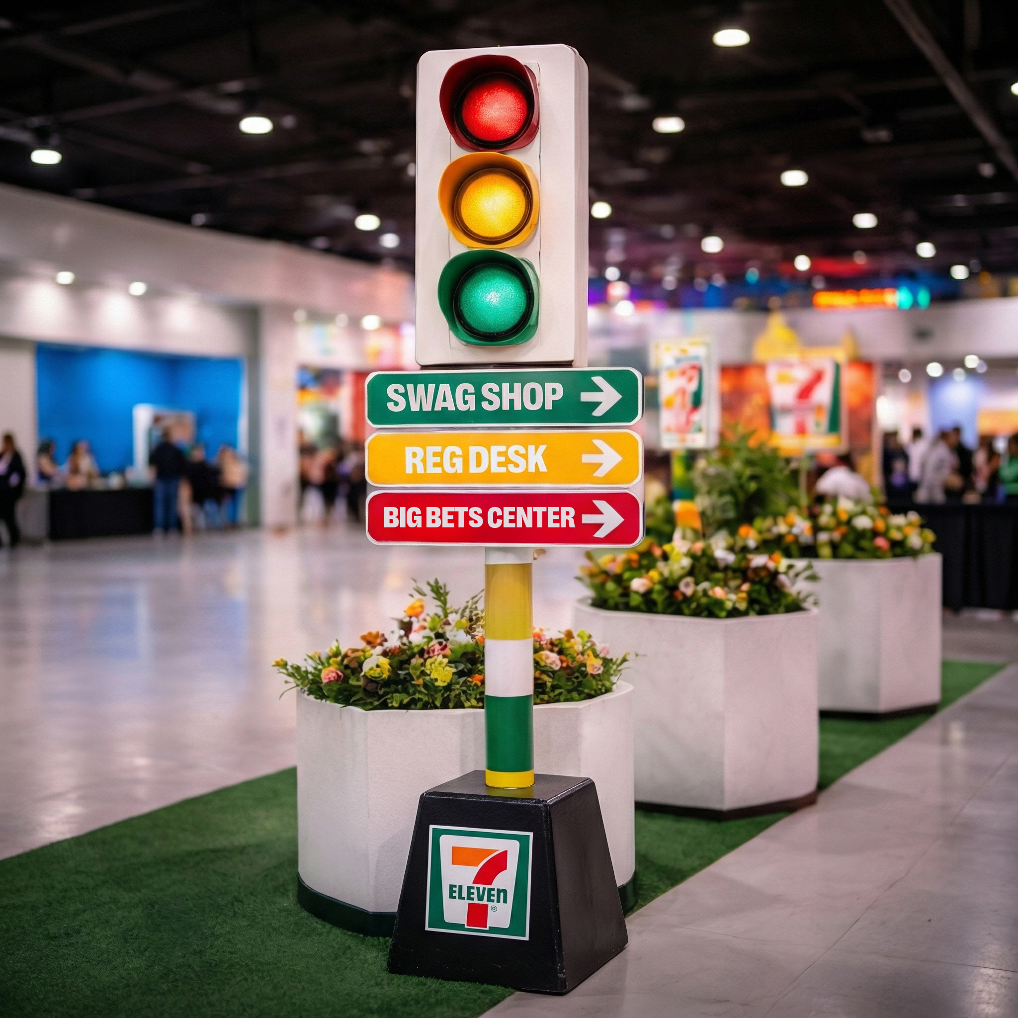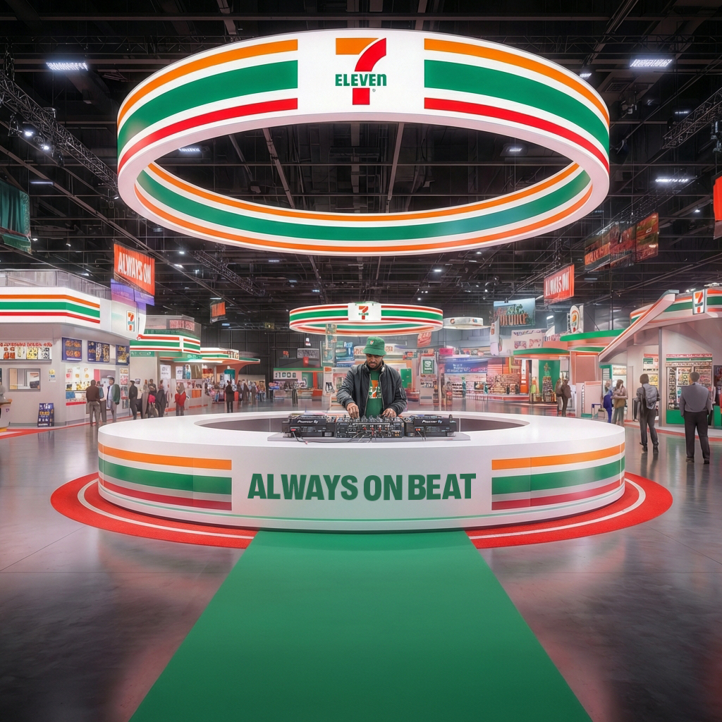 Overhead signage with booth numbers, commonly used at big shows, streamlines wayfinding. But if you want to go more on brand, use iconic 7-11 products as wayfinding elements (e.g., Slurpee Street, Big Gulp Blvd.). Watch the video to see our work at Mandalay Bay Convention Center.