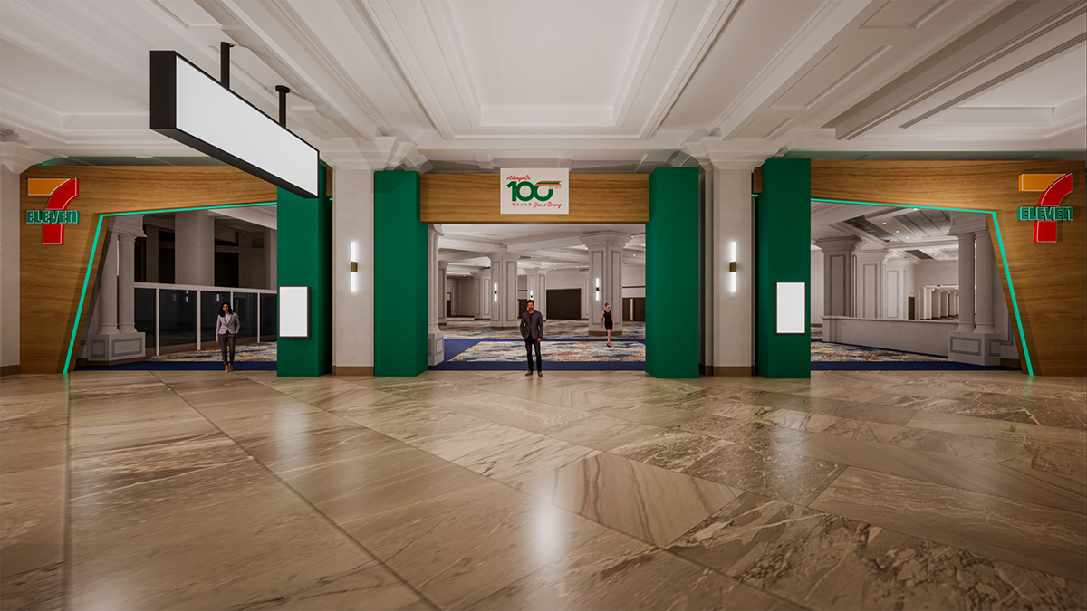 For an audience of 13,000, the entryway is the first proof point of the 7EE theme: “Always On, 100 Years Strong.” This bold statement serves as a visual hallmark, building hype and reassuring attendees that they’re in the right place. Attendees should feel the energy of 7EE from their first step inside the expo hall.